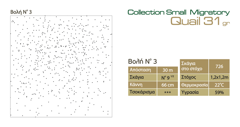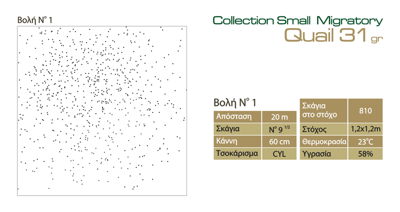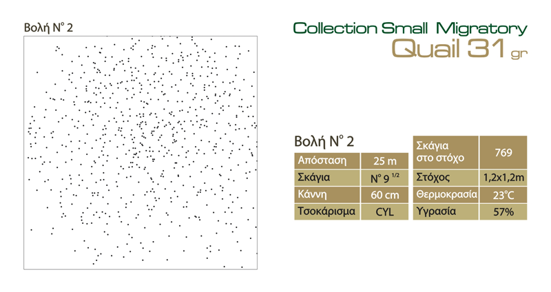 Τα Quail 31 gr μπορούν να χρησιμοποιηθούν από όλα τα σύγχρονα όπλα cal 12 με θαλάμες 70 mm ή 76 mm. Αποδίδουν εξαιρετικά με ανοικτά τσοκαρίσματα (****), (CL) για πρώτες βολές.